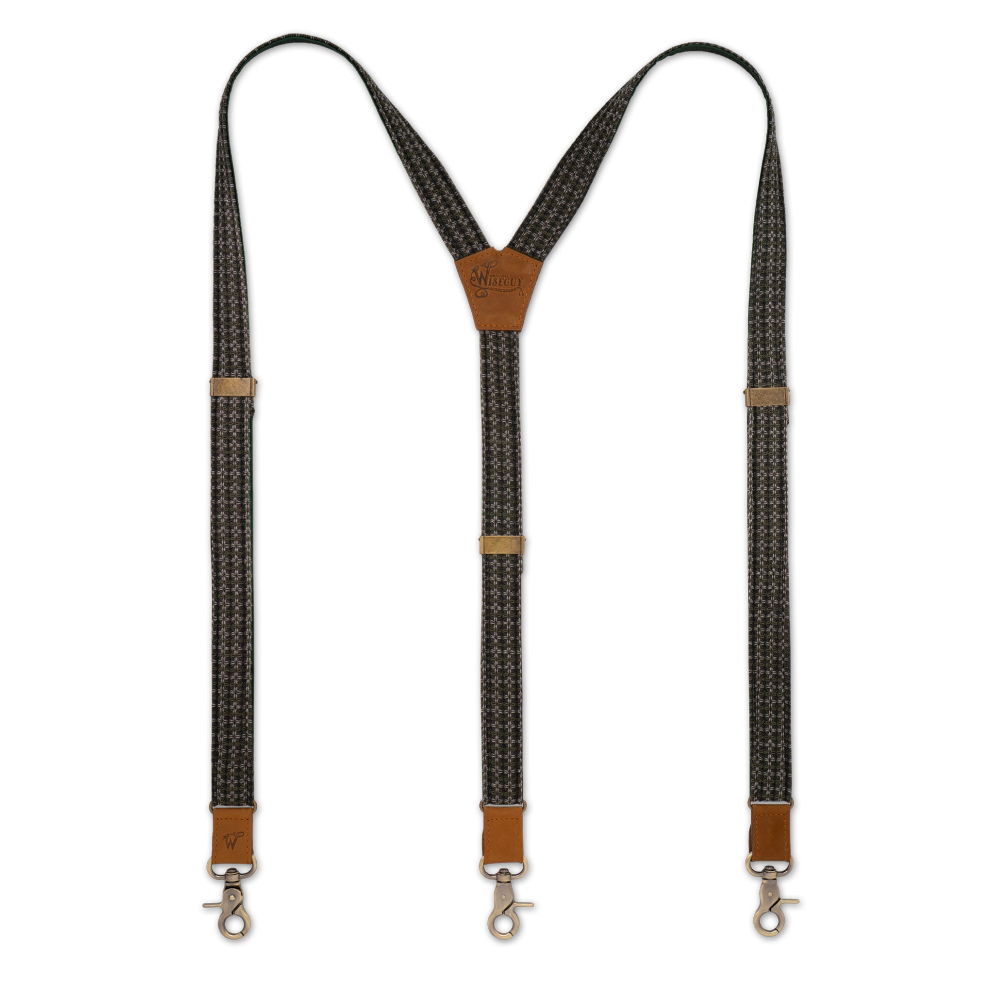 Flat lay of Beige Wiseguy Charger Suspenders with Dark Brown Authentic Nubuck Leather and European Elastic Webbing Straps, Brass Metal hardware and Y-back Design. Back detail of Wiseguy Charger Suspenders with logo embossed on Dark Brown Authentic Nubuck Leather Y-connector.