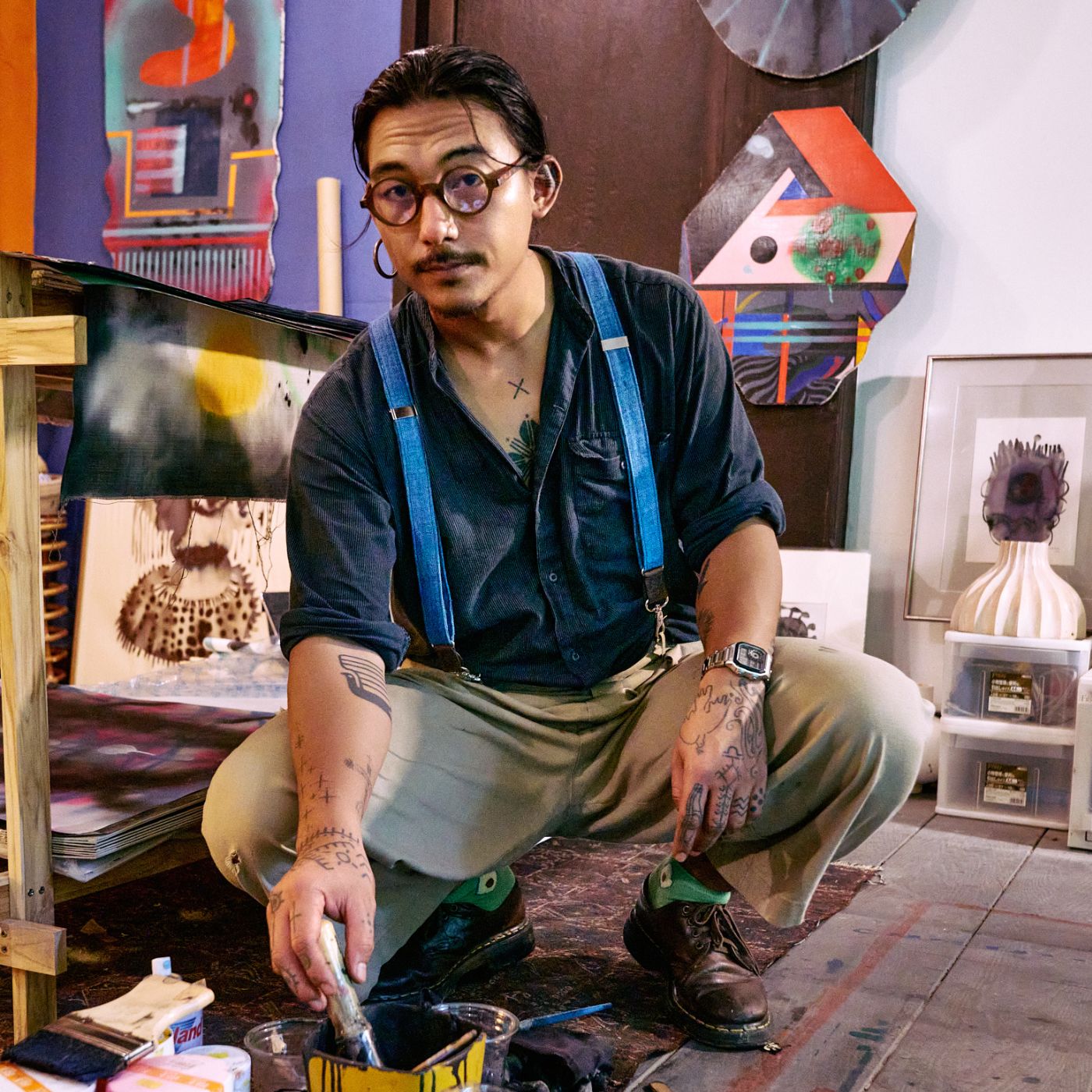 Man wearing Dark Brown Wiseguy Crazy Horse Suspenders over a denim shirt, styled with a pipe and hat in dark setting