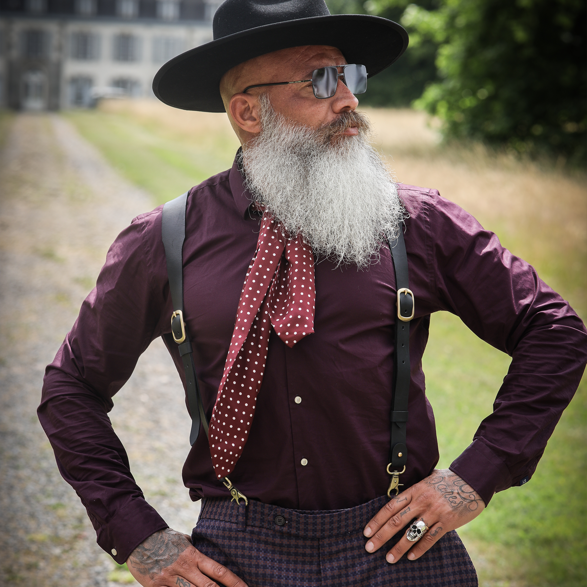 Look at suspenders as part of your essentials. Why not make use of our offer to purchase 3 and get the 4th pair for free? This way, you can choose different colors and materials. We are one of the leading brands using different materials for suspenders. From all leather to combinations of leather parts and recycled fabrics like vintage US Army tents. Not only do they look great but they certainly make great conversation pieces, promised! We have a magnitude of different colors in our elastics and a number of our colors are available with different color leathers. If you are just starting to wear suspenders, it may be an idea to build a basic elastic collection and add to this - as time passes. We suggest to choose the super basics and always have these at hand in colors such as navy blue suspenders, red suspenders, black suspenders and maybe even white suspenders. Also, you may want to add some stripes too. When you have these colors and color combinations as part of your wardrobe, you’re always able to make great combinations and stand out looks.